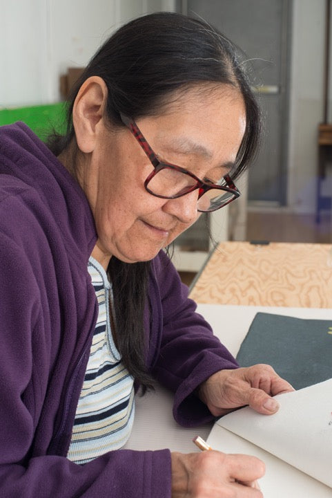 Born in 1959 in Iqaluit, Pauojoungie is the daughter of Inooki and Qimirpikuluk Oqutaq. She has a sister Napatchie and two brothers Lasaloosie and Niviaqsi. Growing up, she lived in various camps with her family throughout southwest Baffin Island, the last one being just southeast of Cape Dorset. It is here that Pauojoungie had an opportunity to see all manner of birds and animals which she enjoyed so much that she began drawing wildlife.